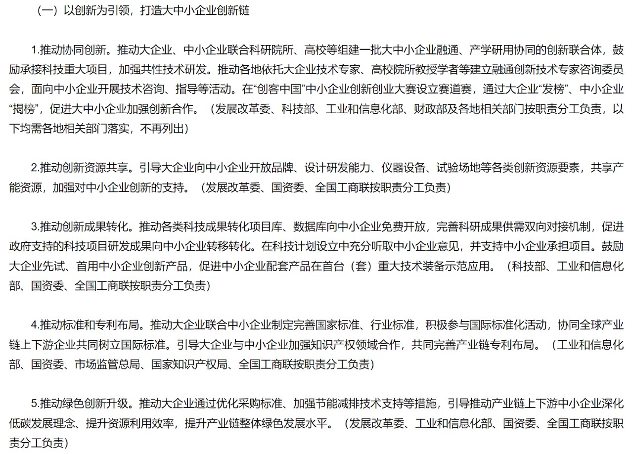 《攜手行動(dòng)》提到要從推進(jìn)協(xié)同創(chuàng)新、推進(jìn)創(chuàng)新資源共享、推進(jìn)創(chuàng)新成果轉(zhuǎn)化、推動(dòng)標(biāo)準(zhǔn)和專(zhuān)利布局、推動(dòng)綠色創(chuàng)新升級(jí),五方面打造大中小企業(yè)創(chuàng)新鏈。
