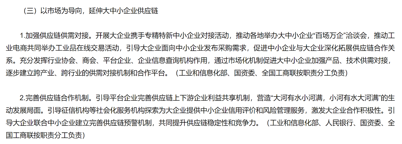 《攜手行動(dòng)》提到要從加強(qiáng)供應(yīng)鏈供需對(duì)接,完善供應(yīng)鏈合作機(jī)制兩方面延伸大中小企業(yè)供應(yīng)鏈。