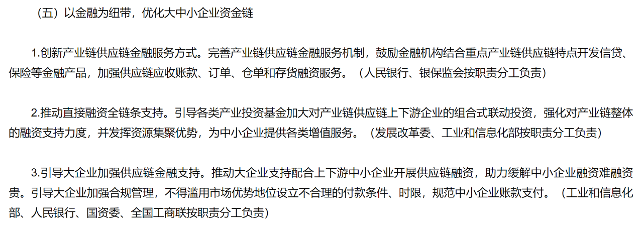 《攜手行動(dòng)》提到要?jiǎng)?chuàng)新產(chǎn)業(yè)鏈供應(yīng)鏈金融服務(wù)方式,推動(dòng)直接融資全鏈條支持,引導(dǎo)大企業(yè)加強(qiáng)供應(yīng)鏈金融支持。