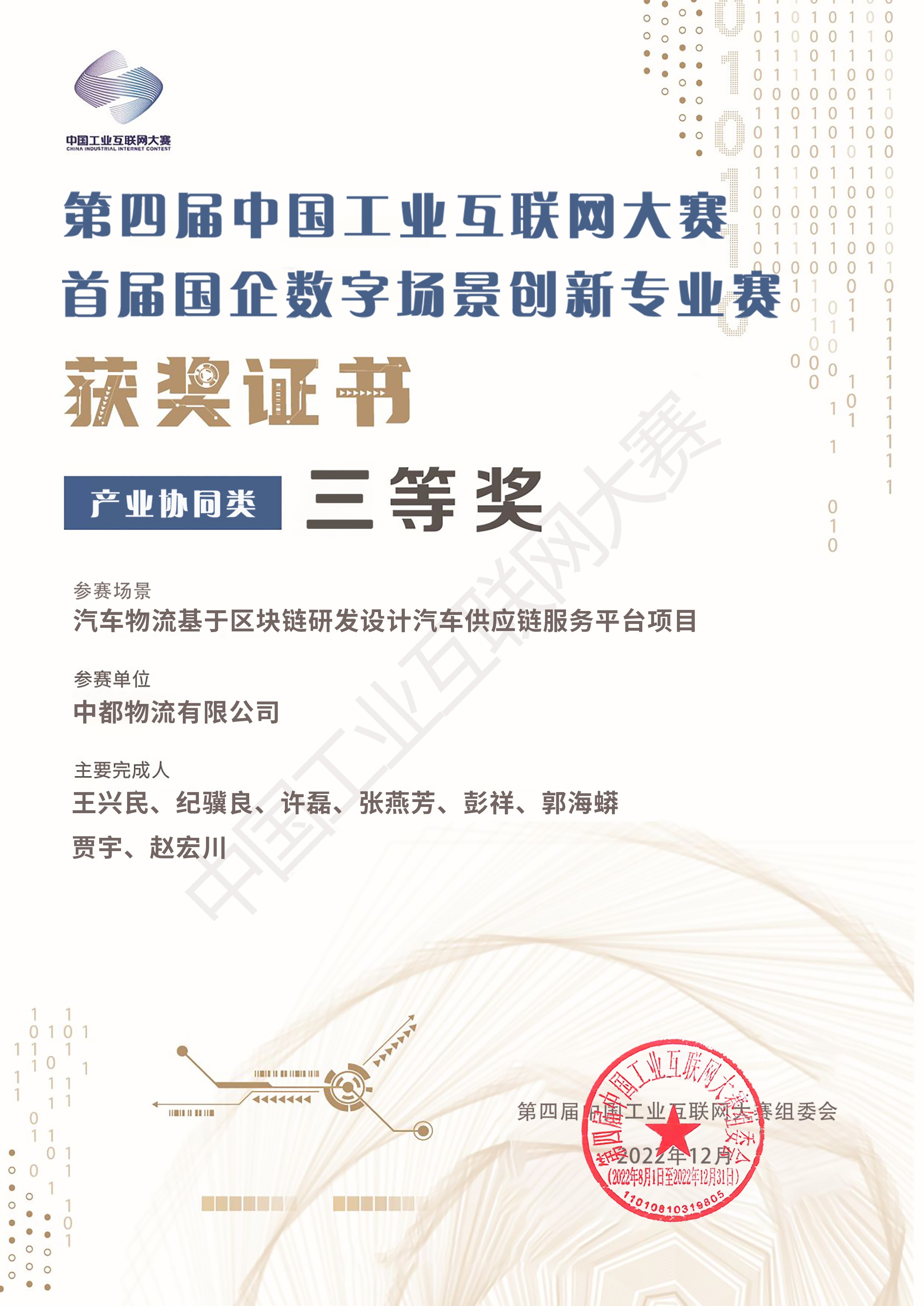 近日,由國(guó)務(wù)院國(guó)資委、工業(yè)和信息化部、中華全國(guó)工商業(yè)聯(lián)合會(huì)、浙江省人民政府聯(lián)合主辦的第四屆中國(guó)工業(yè)互聯(lián)網(wǎng)大賽結(jié)果正式揭曉,中都物流有限公司提報(bào)的“汽車物流基于區(qū)塊鏈研發(fā)設(shè)計(jì)汽車供應(yīng)鏈服務(wù)平臺(tái)”項(xiàng)目在國(guó)企數(shù)字場(chǎng)景創(chuàng)新專業(yè)賽中斬獲三等獎(jiǎng)。