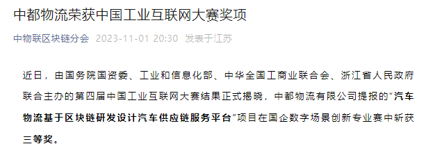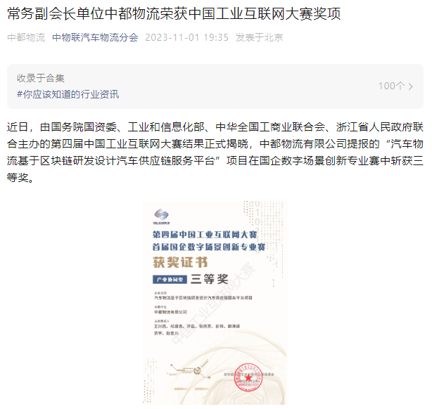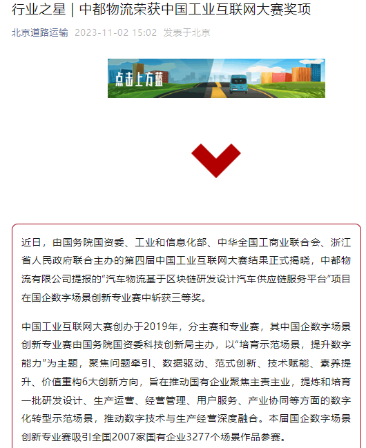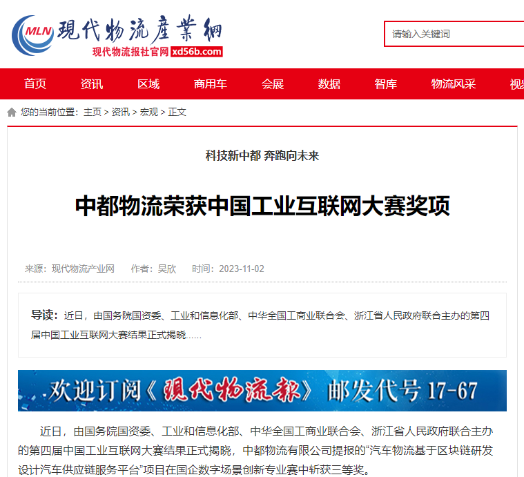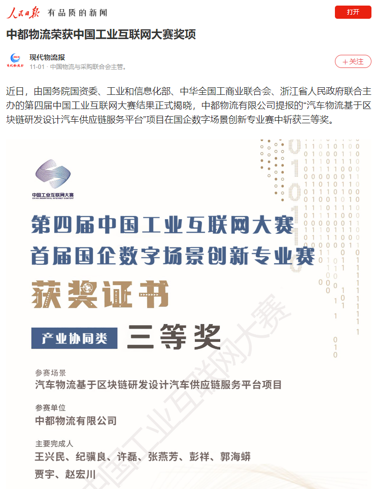 獲獎信息受到行業(yè)內(nèi)外廣泛關(guān)注,央媒、行業(yè)協(xié)會、行業(yè)權(quán)威媒體、各大實(shí)力媒體聚焦中都物流,人民日報端、現(xiàn)代物流報、搜狐、今日頭條等多家媒體轉(zhuǎn)載中都物流榮獲中國工業(yè)互聯(lián)網(wǎng)大賽獎項(xiàng)信息。