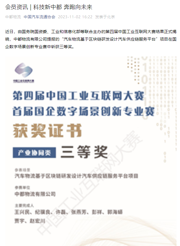 近日,中都物流秉承“科技驅(qū)動型智慧物流企業(yè)”定位,探索前沿技術(shù),提報“汽車物流基于區(qū)塊鏈研發(fā)設(shè)計(jì)汽車供應(yīng)鏈服務(wù)平臺”項(xiàng)目,榮獲第四屆中國工業(yè)互聯(lián)網(wǎng)大賽國企數(shù)字場景創(chuàng)新專業(yè)賽三等獎。