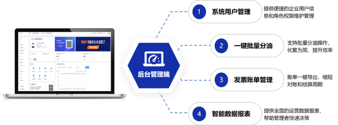 管理者可使用管理后臺(tái),完成用戶(hù)信息維護(hù)、一鍵分油、結(jié)算對(duì)賬和數(shù)據(jù)監(jiān)控分析等精益化管理動(dòng)作。