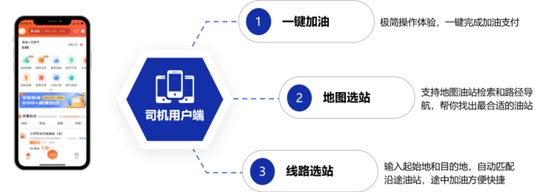 司機(jī)用戶(hù)可使用手機(jī)APP,輕松完成線(xiàn)路規(guī)劃、油站檢索、路徑導(dǎo)航和一鍵加油等一系列智能化的加油操作。